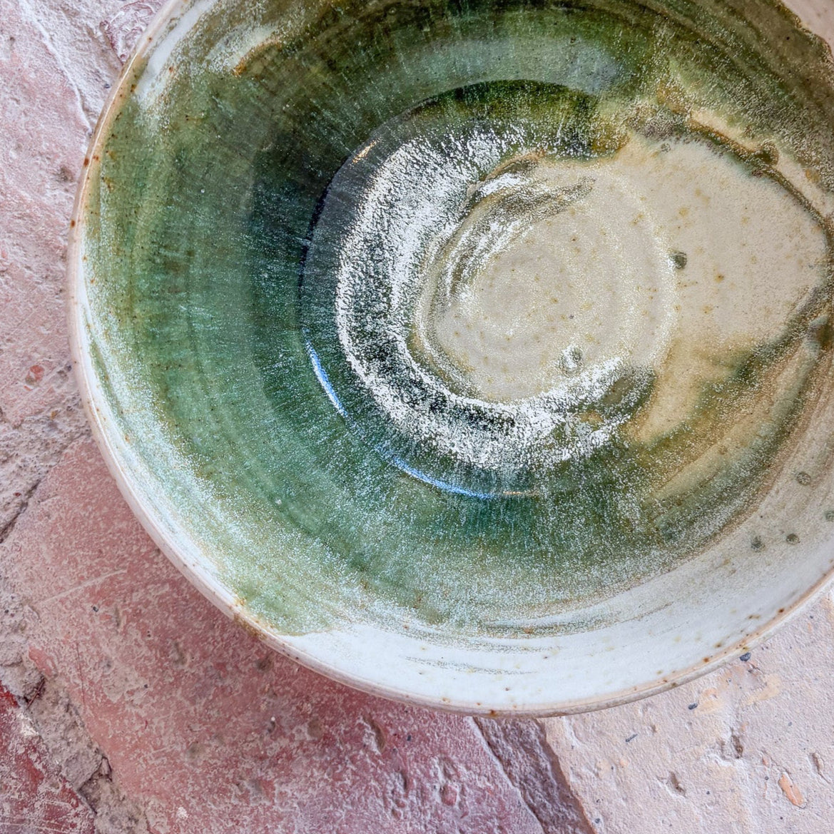 En stor drejad skål i rustik vit glasyr med gröna detaljer.
