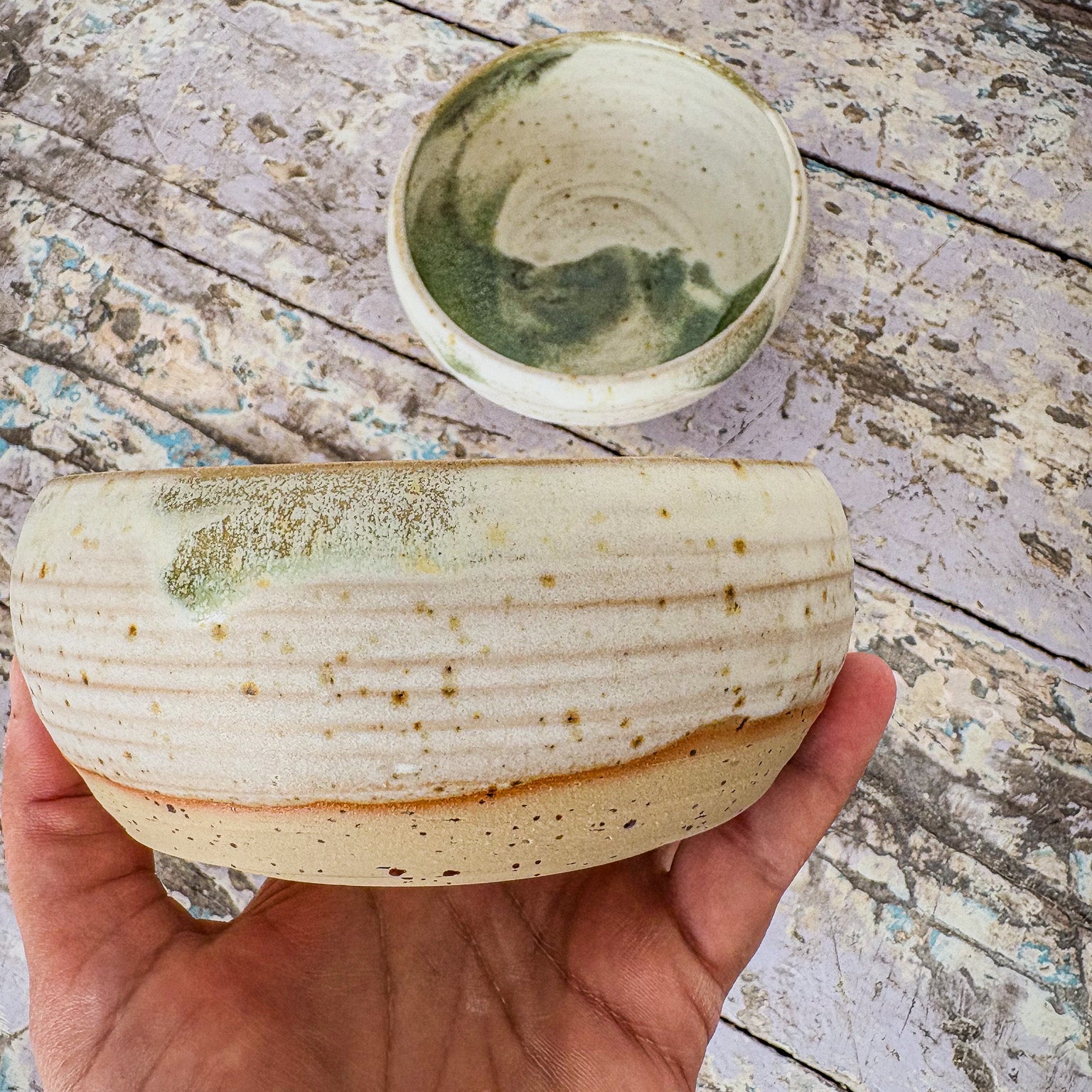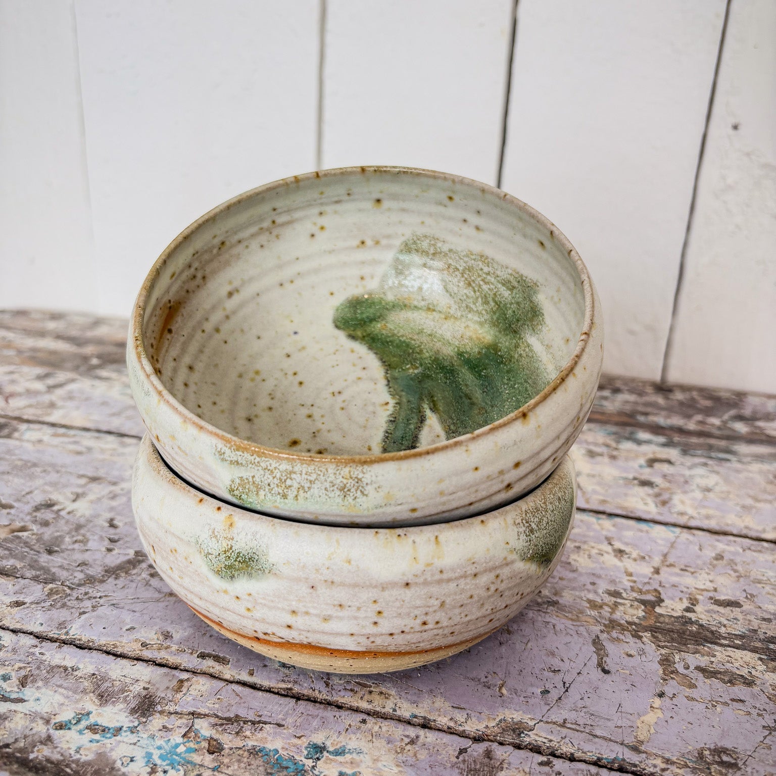 En drejad skål i rustik vit glasyr med gröna detaljer.